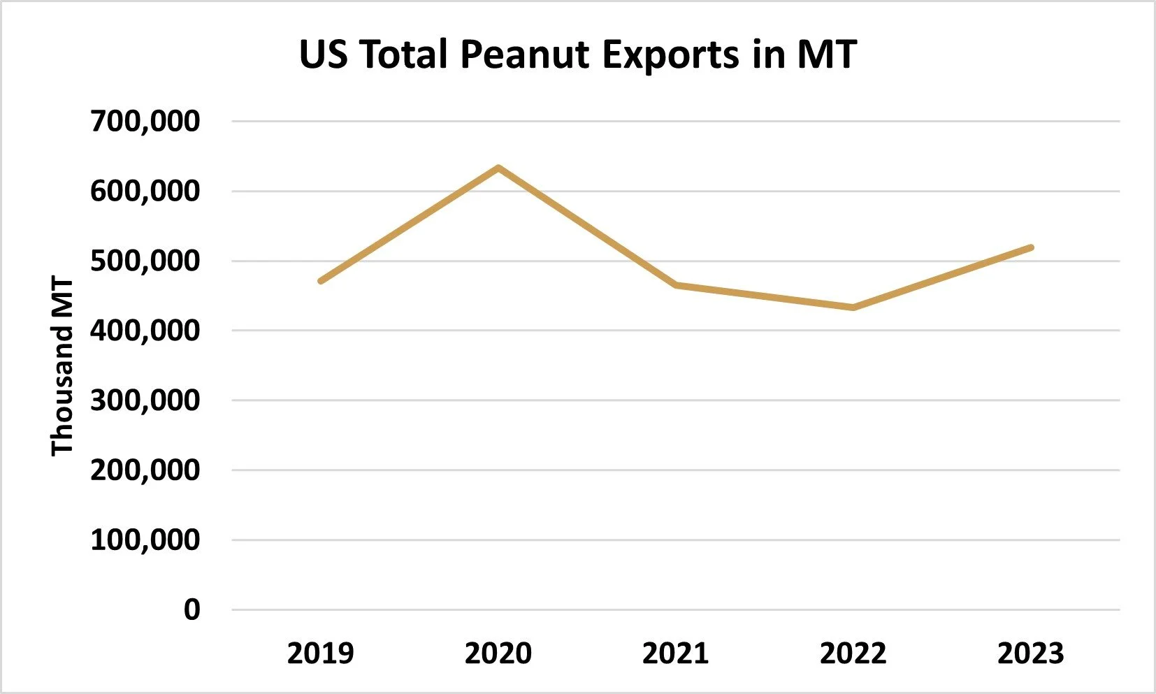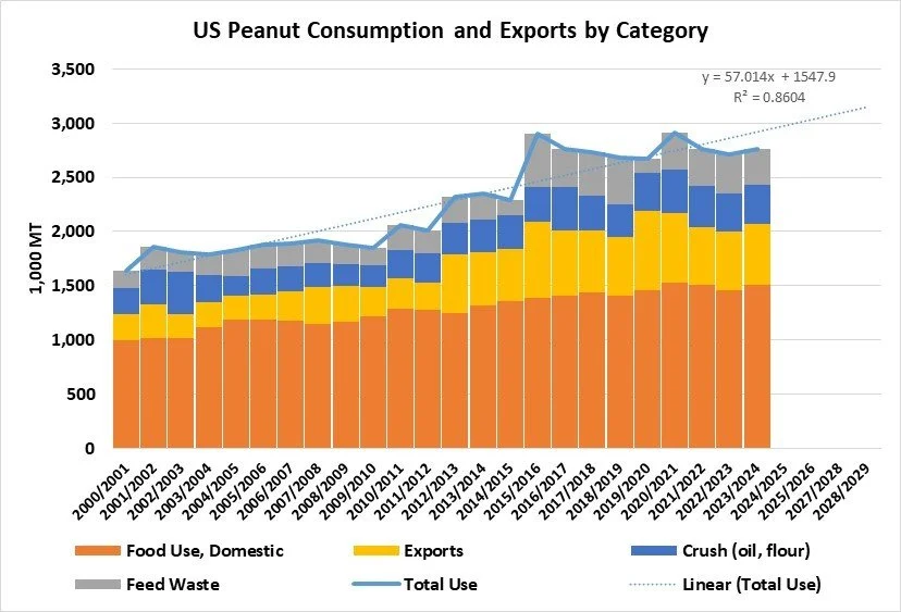 Also note the trendline (dotted) through the blue line representing total use. If the current 25-year trendline holds, total US peanut production and usage would exceed 3,000,000 MT by 2028/2029.