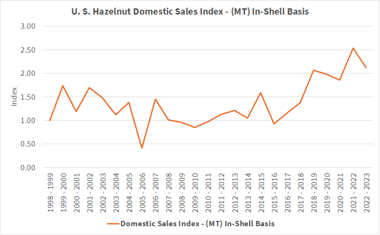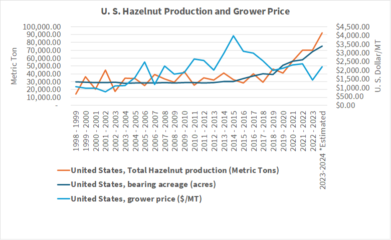 According to the USDA, U.S. Hazelnut production has increased 538% over the past 25 years, from 14,061.36 MT in 1998-1999 to 70,306.81 MT in 2022-2023. The period from 2010-2017 saw strong pricing for growers which, combined with the release of new blight-resistant tree varieties, caused new hazelnut plantings to surge. The downward price pressure from this rapid expansion was severely felt by growers once these new plantings hit production in 2021 and 2022. The initial 2023 guaranteed minimum price from the Hazelnut Bargaining Association once again looked bleak, but poor production in Turkey and Italy helped boost U.S. prices. Bonuses were announced in January 2024, almost doubling the initial guaranteed price. The final 2023 field price has yet to be released as of the writing of this article.[4]