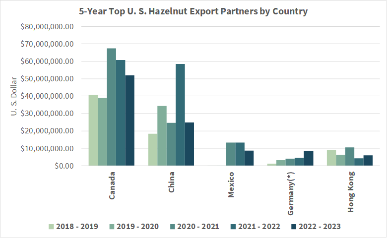 Historically, China has been the ultimate consumer of U. S. Hazelnuts but that is no longer the case. For the past five years, Canada has consistently been the largest purchaser of U.S. Hazelnuts by value. In fact, the five-year gross U. S. Hazelnut sales to Canada have surpassed the five-year gross U. S. Hazelnut sales to China, Hong Kong, Mexico, and Germany COMBINED. U. S. Hazelnut sales to Canada has grown by over 2,510% in the past 25 years and our Hazelnut sales to Mexico have grown by over 1,659% in that same time. This is a good indicator that the U. S. hazelnut market is adapting well to the pressure from high tariffs and increased costs of shipping abroad.