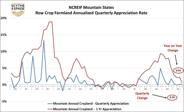 Mountain state row crop land remained positive at +03% vs Q3 and +0.6% for the year, lagging US cropland trips by about three quarters last year.