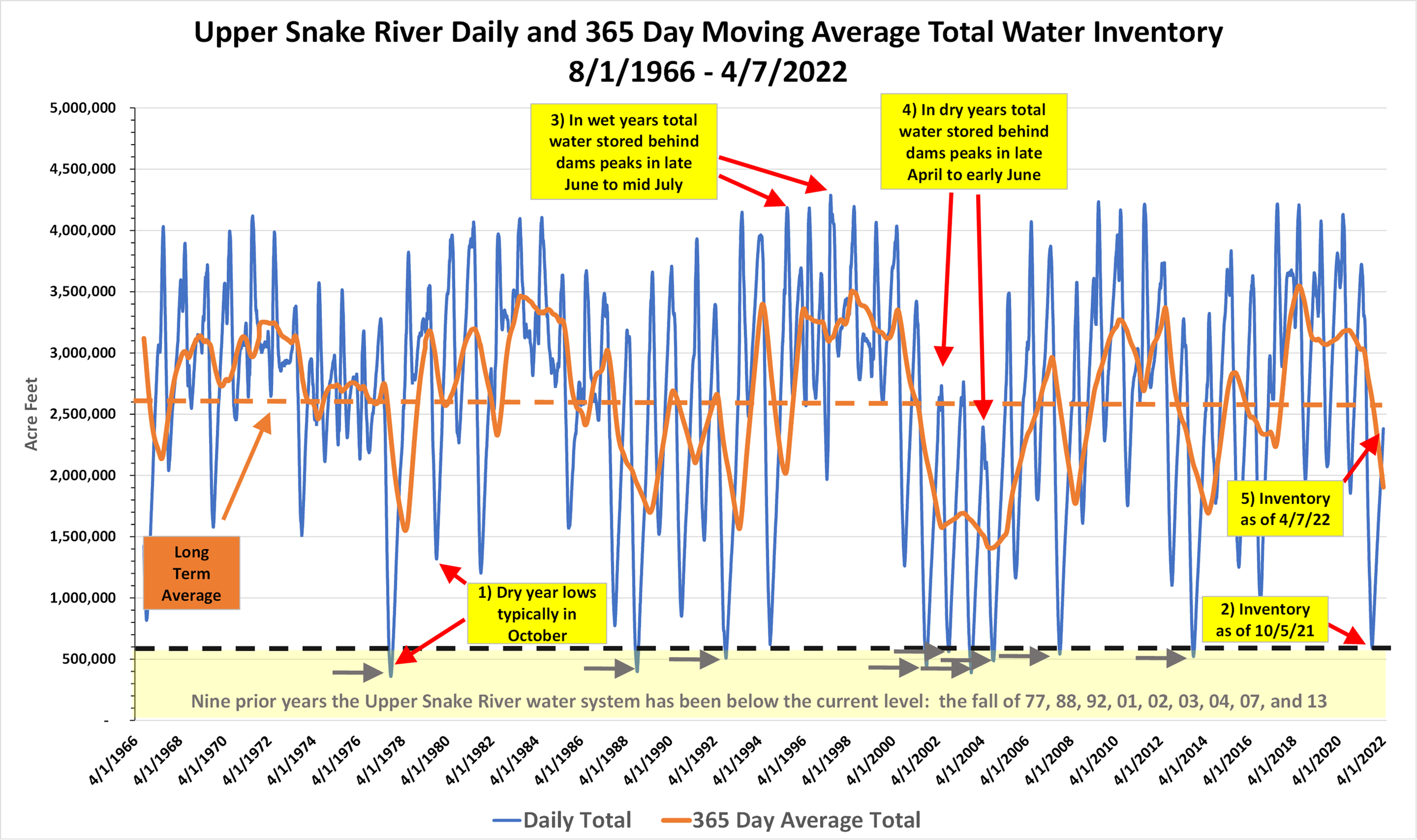 The blue line is the daily total of water stored in the dam system of the Upper Snake River in eastern Idaho and the northwest corner of Wyoming. The oscillation of that line shows the annual seasonal change in that inventory as the total stored water hits its lowest levels in early October (box 1), builds into late spring and early summer, and then decreases through the remainder of the summer as water is released from those dams for irrigation and other uses.