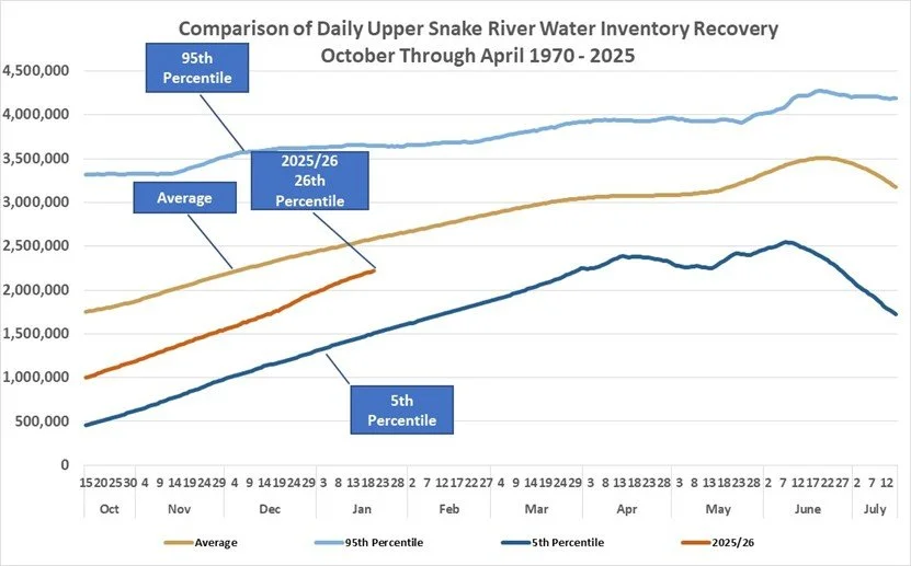The chart below shows us where that water inventory is to date in acre feet. The gold line is the daily average as we rebuild inventories starting from the end of the previous irrigation season (mid-October) from the 1970 season through 2025. The top light blue line shows the upper 95th percentile across those years. 95% of all years had inventories at or below that line on each date. The lowest dark blue line is the bottom 5th percentile. Only 5% of all years had water levels at or below that line on each date. The red line shows the current inventory through January 21st. Although it has been slowly closing the gap with the average inventory through the winter, it began and is currently at the 26th percentile. Certainly below where we would like to see it, but what does it mean in real terms for this summer’s water availability?